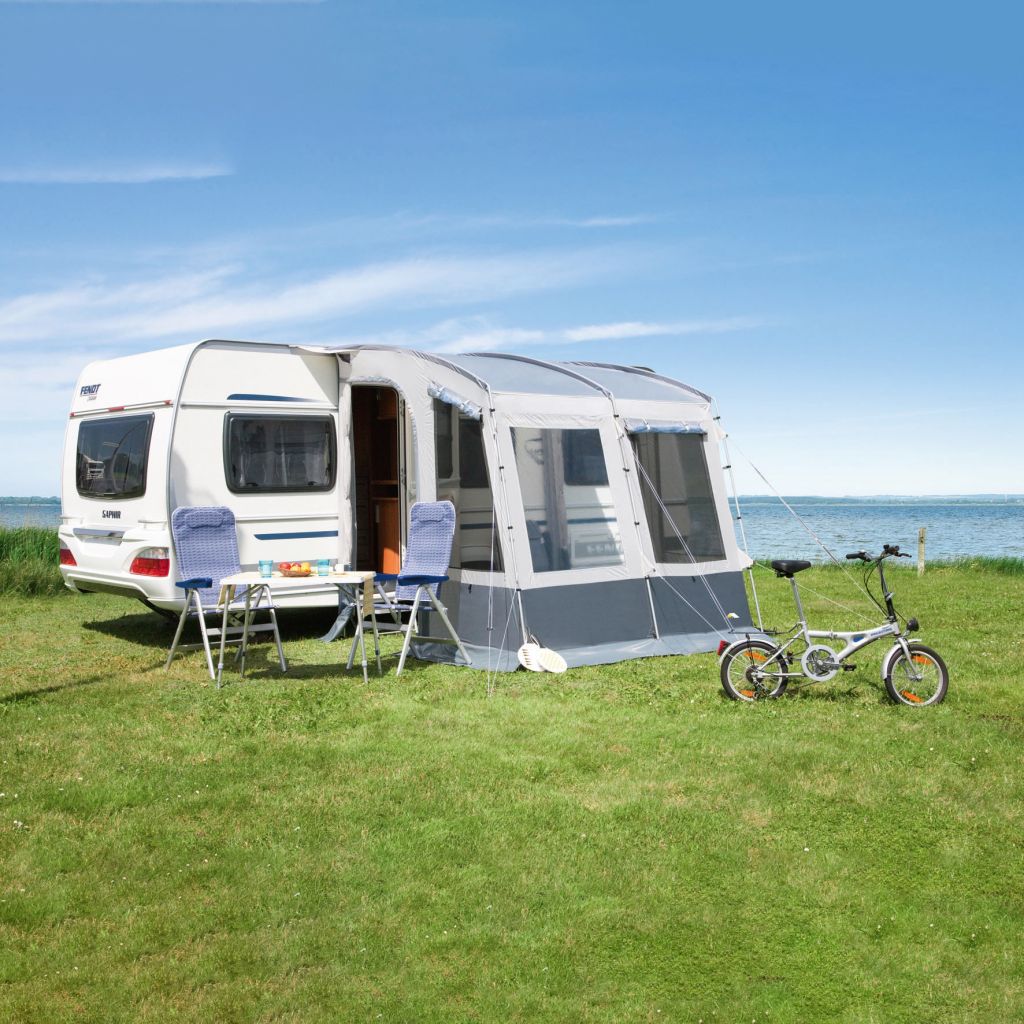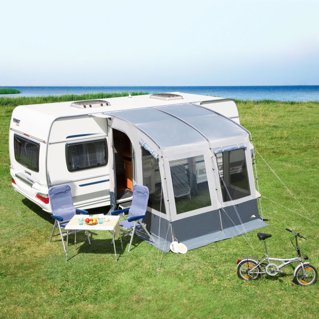 Seitenwände: jeweils mit großem Lüftungsfenster, Außenklappe und Gardine und seitlich wegrollbarer Tür, die Reißverschlüsse sind abgedeckt.