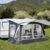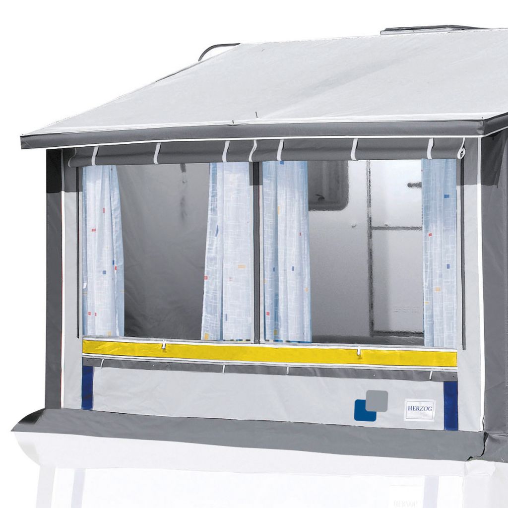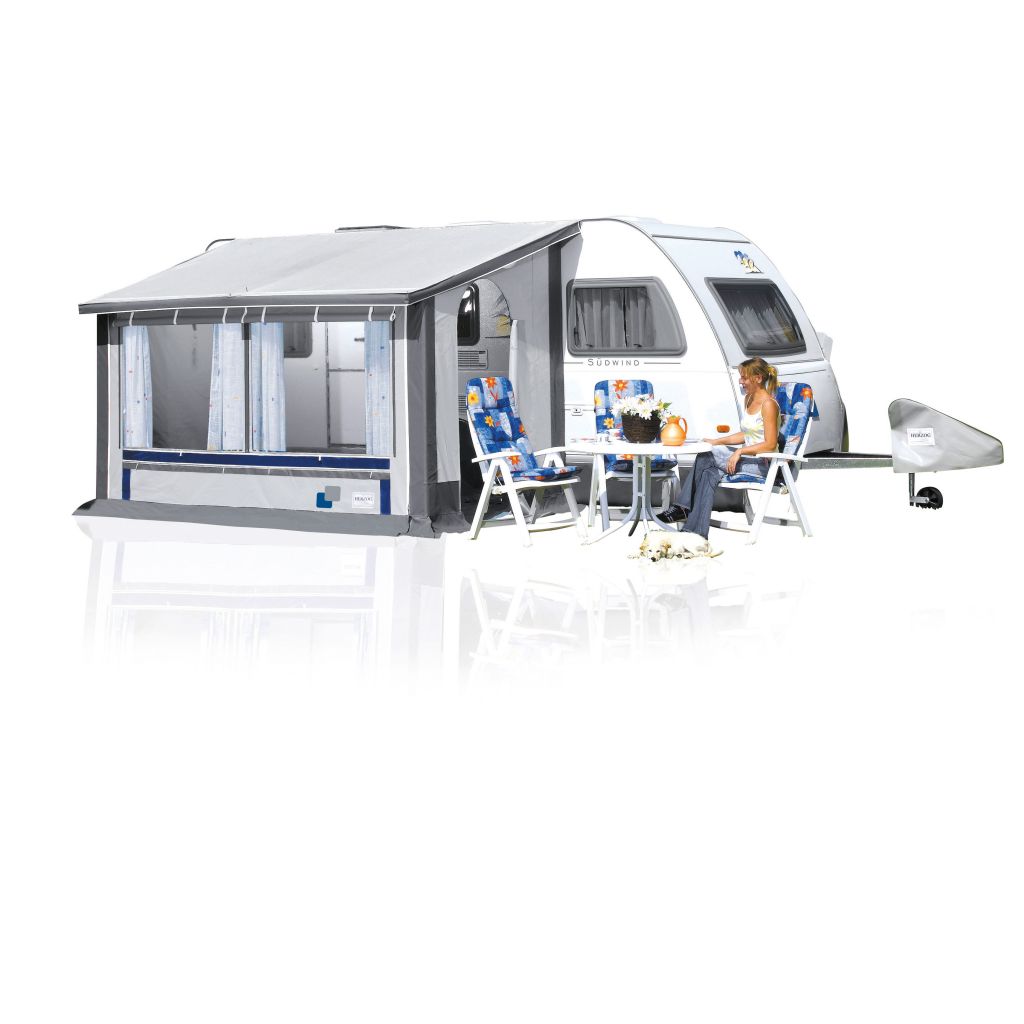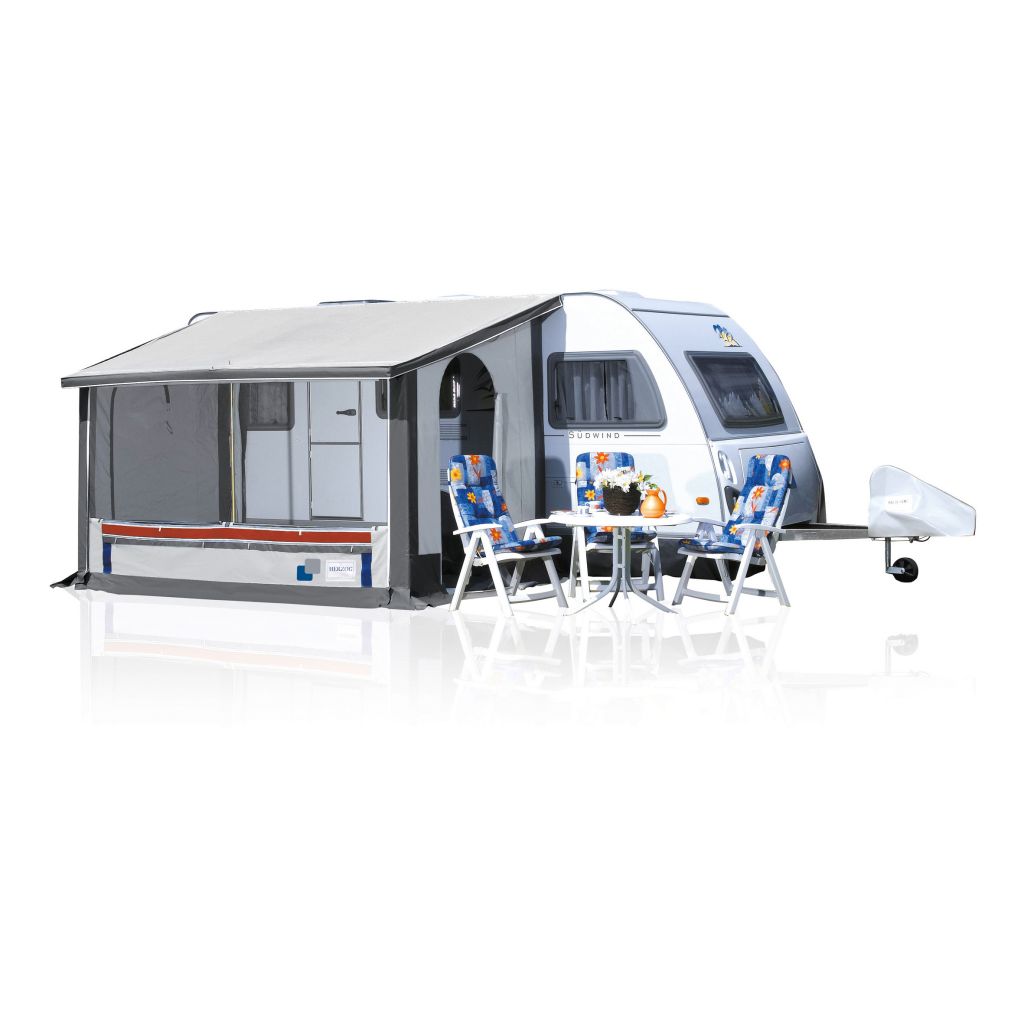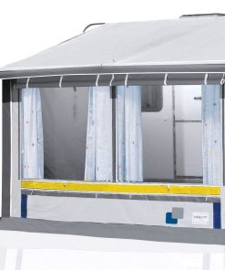 Vorderwand: Fenster mit Gardinen und abgedeckter Gardinenführung. Fensterklappen mit Reißverschluss verschließbar. Sturmleiste und Hohlsäume unter den Fenstern. Multifunktions-Abspannung zur außen- oder innenliegenden Abspannung der Vorzeltwände. Durch die beiliegenden Farbstreifen können Sie das Vorzelt Ihrem Wohnwagen anpassen.