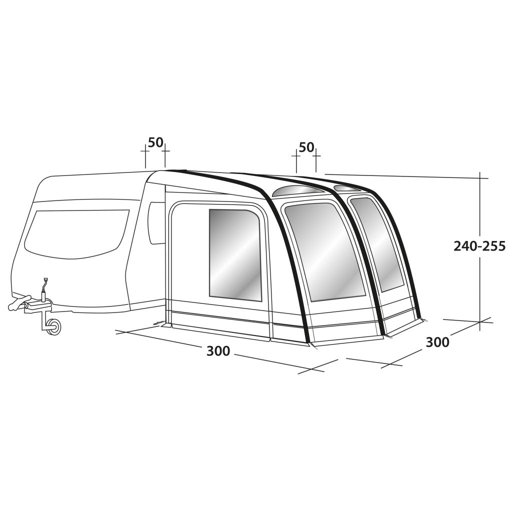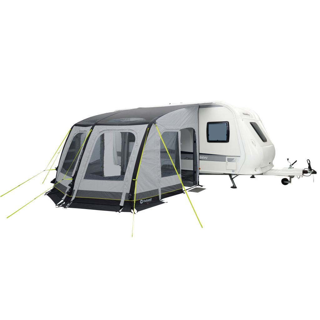 Das Outwell Mirage Vorzelt verfügt über ein extrem robustes Outtex 6000HD Material, welches enorm strapazierfähig ist. Durch die Verbindung zwischen Material und Zeltschnitt, ist der Anschluss an den Wohnwagen sehr gut und das Vorzelt hat einen sehr guten Stand. Trotz des robusten Obermaterials ist das Zelt durch seine verbunden Luftkanäle in wenigen Minuten komplett aufgebaut. Sie können das Zelt ganz einfach mit der mitgelieferten Kolbenpumpe aufpumpen und das Vorzelt in kürzester Zeit beziehen. Die drei Türen in der Front können flexibel je nach Bedarf geöffnet werden und bieten auf jedem Platz eine tolle Aussicht. Weitere Fenster im Dachbereich und den Seitentüren lassen einen angenehmen Lichteinfall zu. Die Seitentüren sind mit Moskitonetzen versehen, sodass auch im Inneren des Zeltes für eine gute Belüftung gesorgt werden kann!