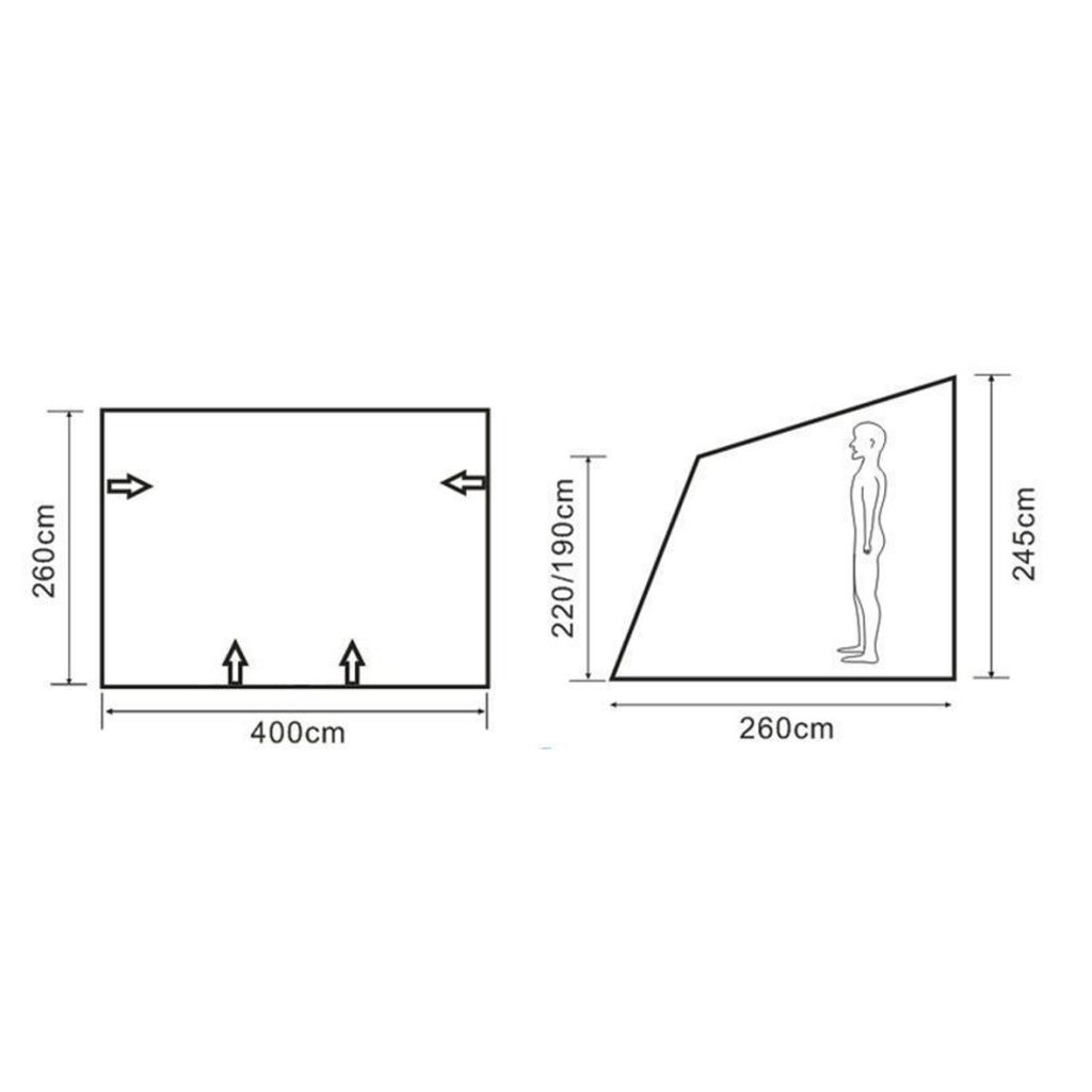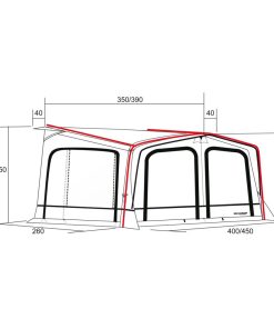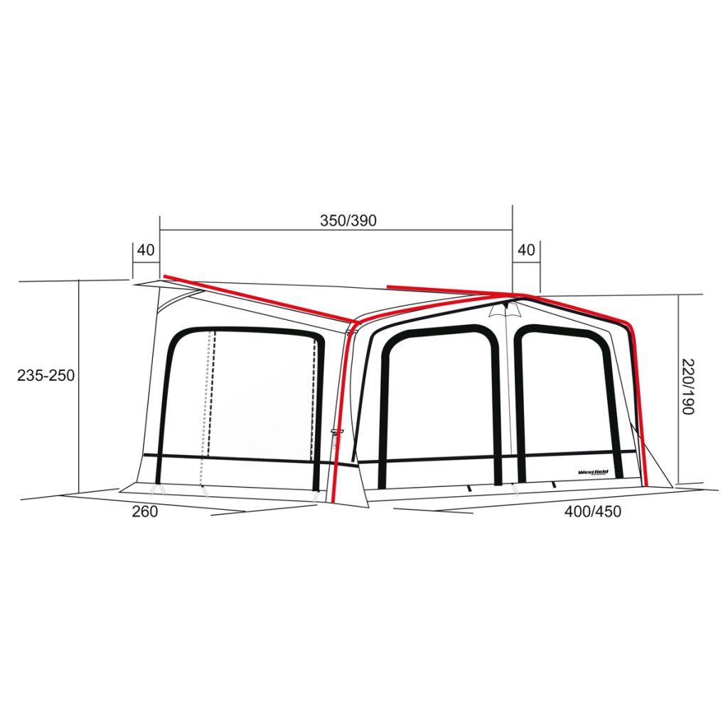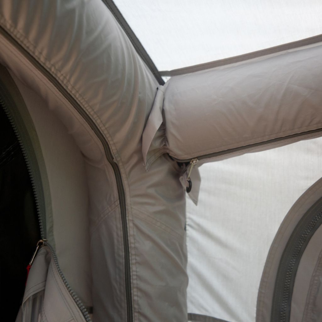 Lieferumfang: Zelt, Airtube, Gestänge, Abspannmaterial, Andruckpolster, Andruckstangen, Bodenschürze, Radabdeckung, Pumpe mit Überdruckventil, Packsack.
