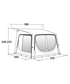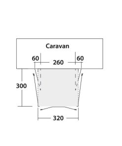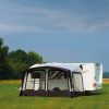 Seitenwände herausnehmbar mit Fenstern, zwei große Seiteneingänge mit Moskitonetz sowie Wetterschutzdach. Pole-free Seal System für einen dichten Anschluss an den Wohnwagen.