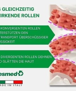 Die Formgebung von Tesmed Cellulite garantiert eine dreifache Wirkung: Die Rollen heben die Haut an, die dann geknetet und schliesslich geglättet wird, wodurch die Durchblutung angeregt und der Abtransport überschüssiger Flüssigkeiten gefördert wird.