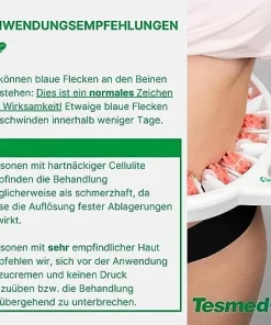 Nicht auf die Haut drücken. Es können Hautrötungen, Schuppenbildungen und leichte Blutergüsse auftreten, die jedoch nur von vorübergehend sind. Tesmed Cellulite wird bei empfindlichen Kapillaren nicht empfohlen.