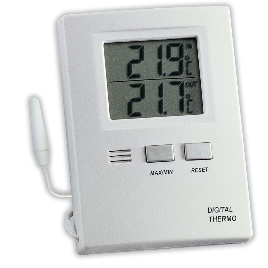 Innen- (-10 bis +50 °C) und Außentemperatur (-50 bis +70 °C), umschaltbar °C/°F, Kabel ca. 3 m, zum Hängen oder Stellen, inkl. Batterie 1,5 V AAA.
