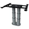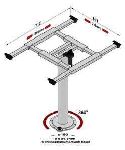 Höhe bis Unterkante Tischplatte 70 cm. Tischverschiebung mit einer zentralen Verriegelung. Quer- und Längsverschiebung um 21,5 cm und 38 cm. Tischverdrehung um 360° mit einer Fußrastung in Nullposition. Sockelplatte mit 6 Löchern zur Befestigung auf dem Fahrzeugboden. Besonders geeignet für Reisemobile und überall da, wo kein Bettbau erforderlich ist. Hohe Stabilität.