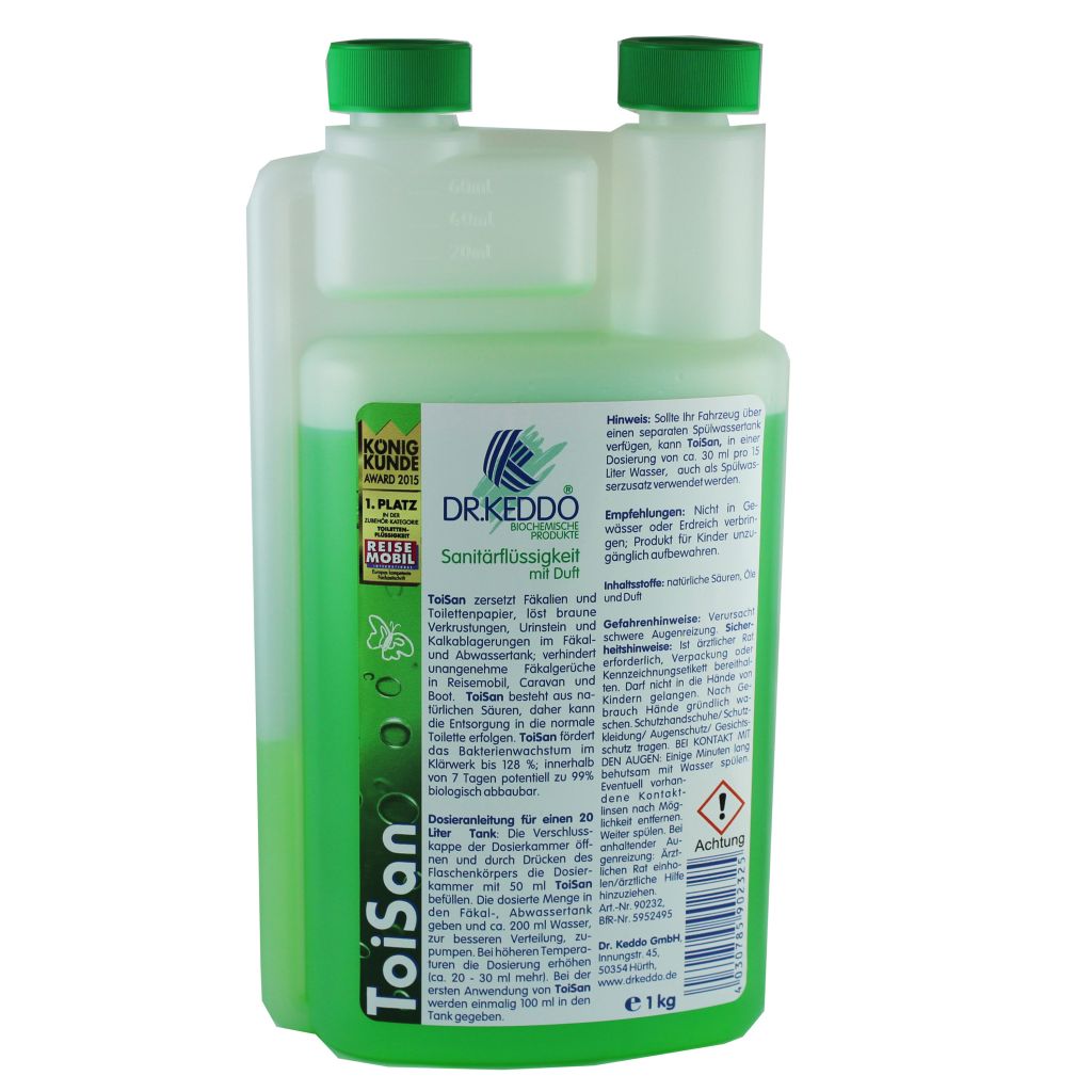 ToiSan verflüssigt Fäkalien, löst Kalkablagerungen, Urinstein von Toilettentank-Wänden und verhindert Geruchsbildung im Abwassertank. Die Sanitärflüssigkeit verbreitet frischen Duft. Biologisch abbaubar.