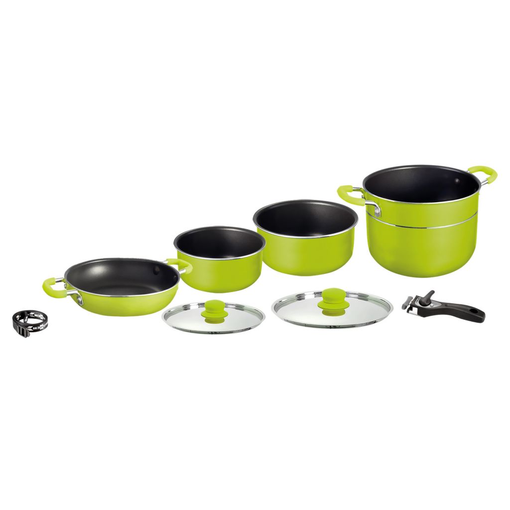 Alu-Topfset mit Edelstahldeckel und Soft-Touch Griffen. Mit Antihaft-Beschichtung.