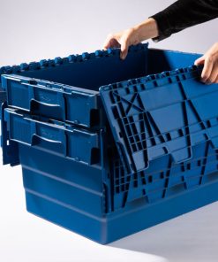 Stapelbare Kunststoffbox, nestbar mit zweigeteiltem Klappdeckel für platzsparende Lagerung und Transport.