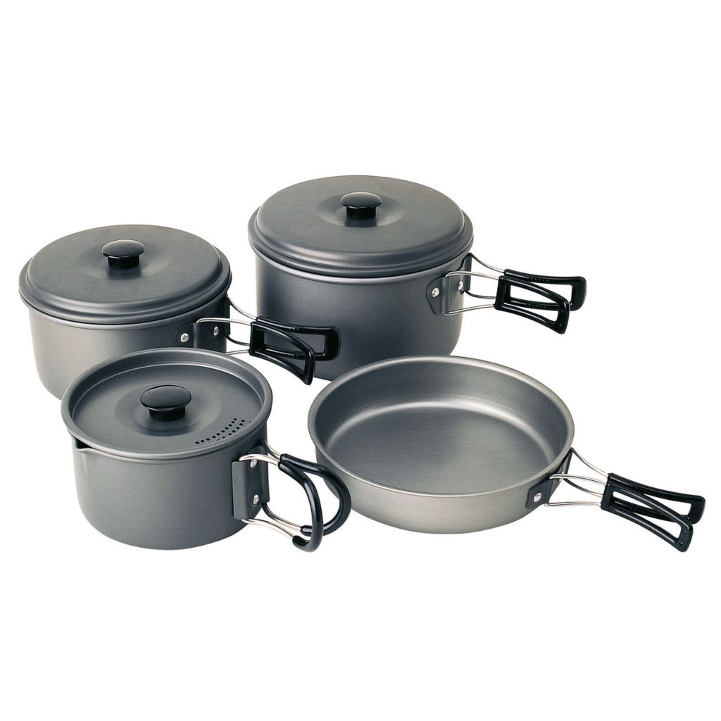 8-tlg., für Gas- und Elektroherde, aus eloxiertem Aluminium. Isolierte, klappbare „Cool Touch“ Griffe. Nicht Spülmaschinen geeignet!