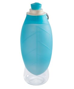 Trinkflasche für Unterwegs. Das Silikonblatt lässt sich als Ausgabe des Wassers verwenden. Die Flasche passt perfekt in Ihre Tasche oder Ihren Becherhalter im Auto.