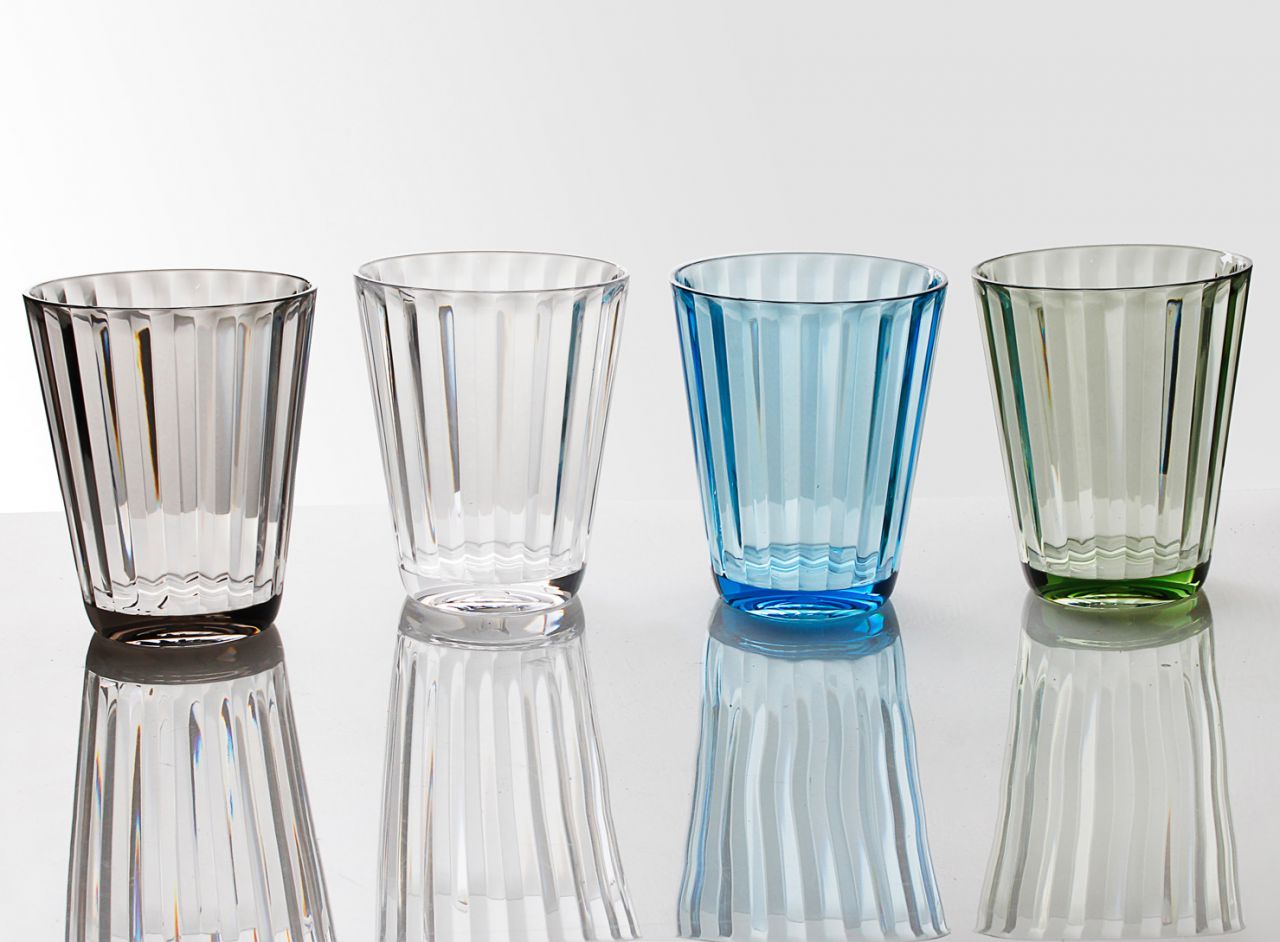 Elegantes Trinkglas-Set im Vintage-Look. Stapelbare Form. Material: lebensmittelechtes Polycarbonat. Farblich sortiert. 4 er-Set. Inhalt 0,3 l.