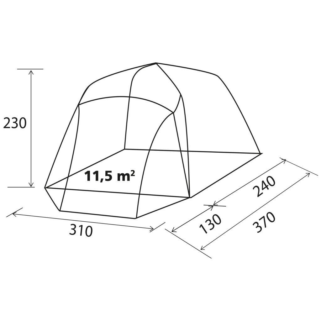 Außenzelt mit Boden, Gestänge, 2 Aufstellstäbe, Schleusenstab, Spannleinen, Heringe, Packsack.