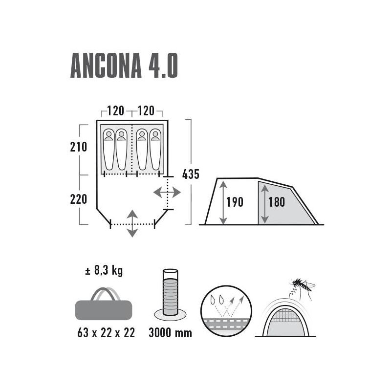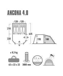 Lieferumfang: Zelt, ø 9,5 mm (Ancona 4) und ø 11 mm (Ancona 5) GFK Gestänge, Abspannmaterial, Heringe, Tragetasche