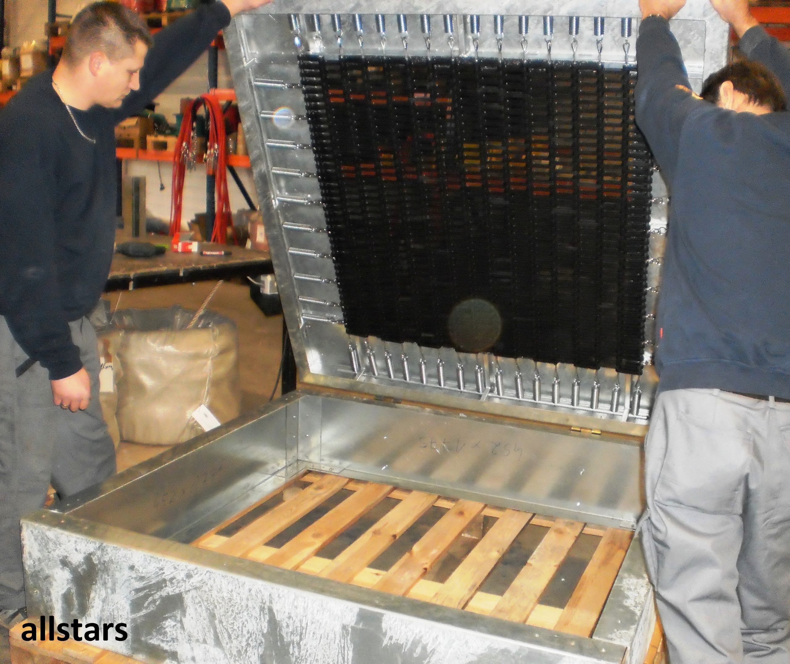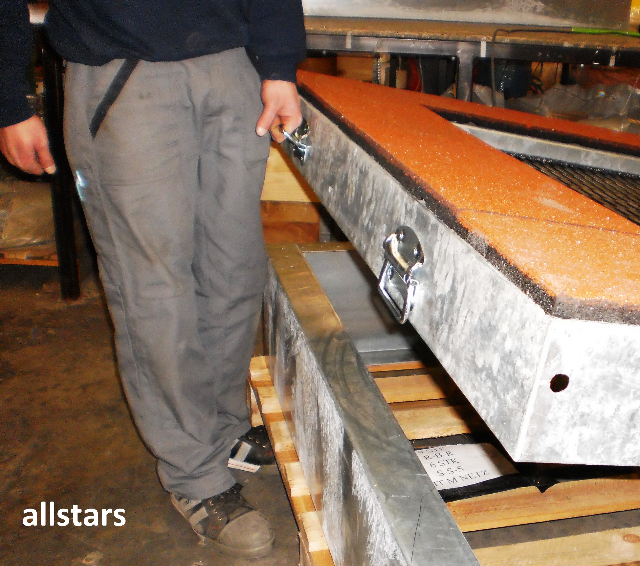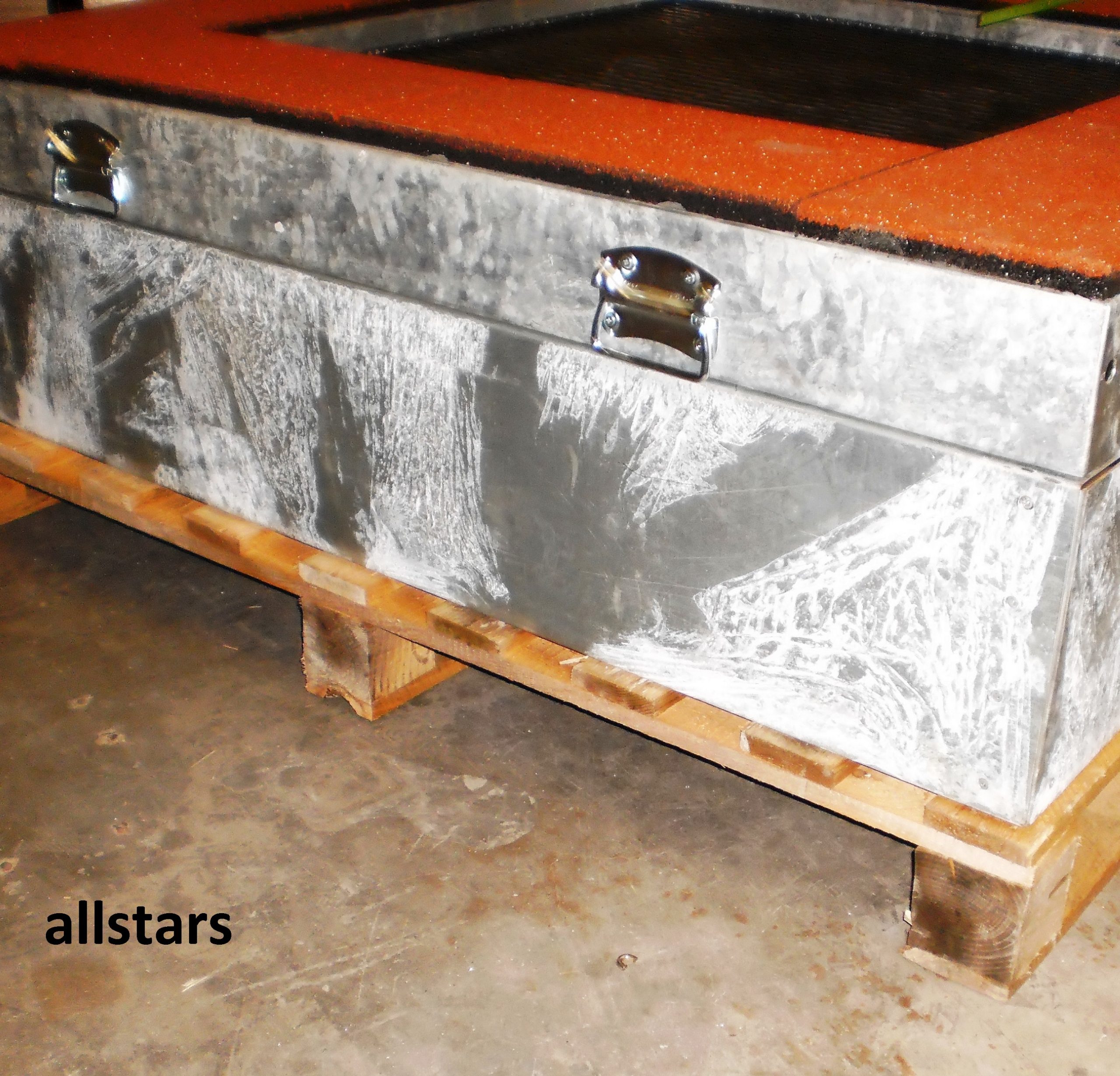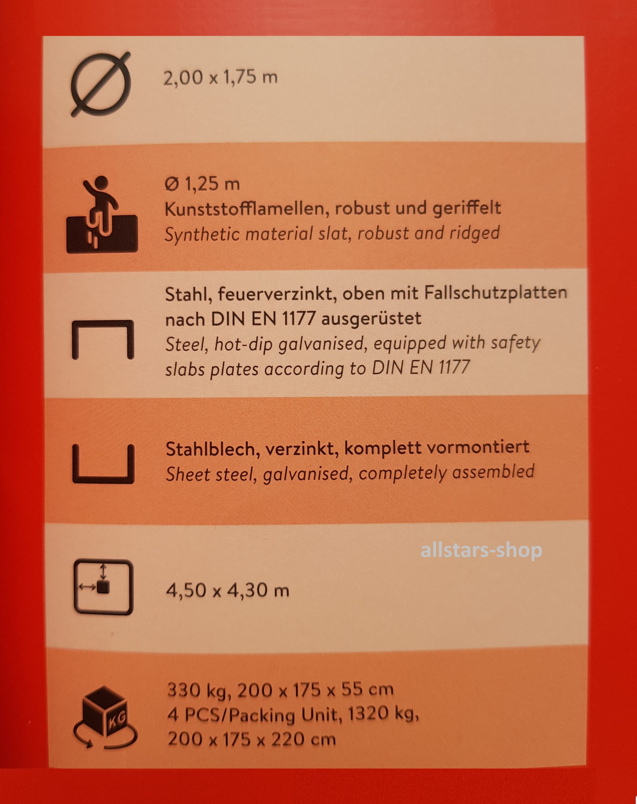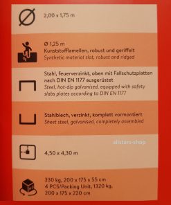 * Oberrahmen: Stahl feuerverzinkt, oben mit Fallschutzplatten, nach DIN EN 1177 ausgerüstet