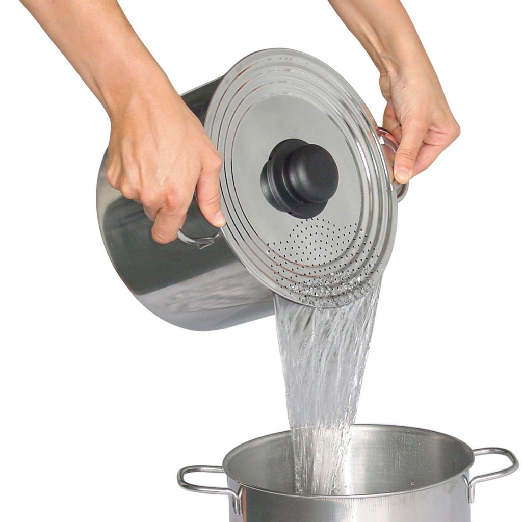 Dank seitlichen Griffen und Dreieckslochung in 2. Funktion als Sieb verwendbar. Edelstahl mit Kunststoffgriff. Passend für Töpfe mit einem Durchmesser von 16 – 22 cm.