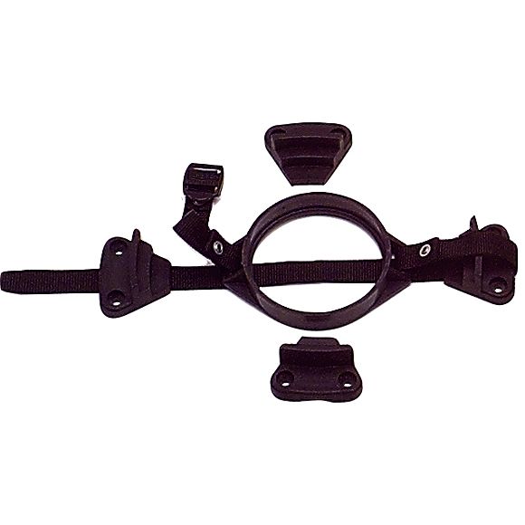 Vier Zentrierstücke aus Kunststoff zum Aufschrauben und zur Aufnahme von 4 verschiedenen Gasflaschengrößen. Der Ring mit Gurt dient der stabilen Befestigung der zentrierten Flasche.