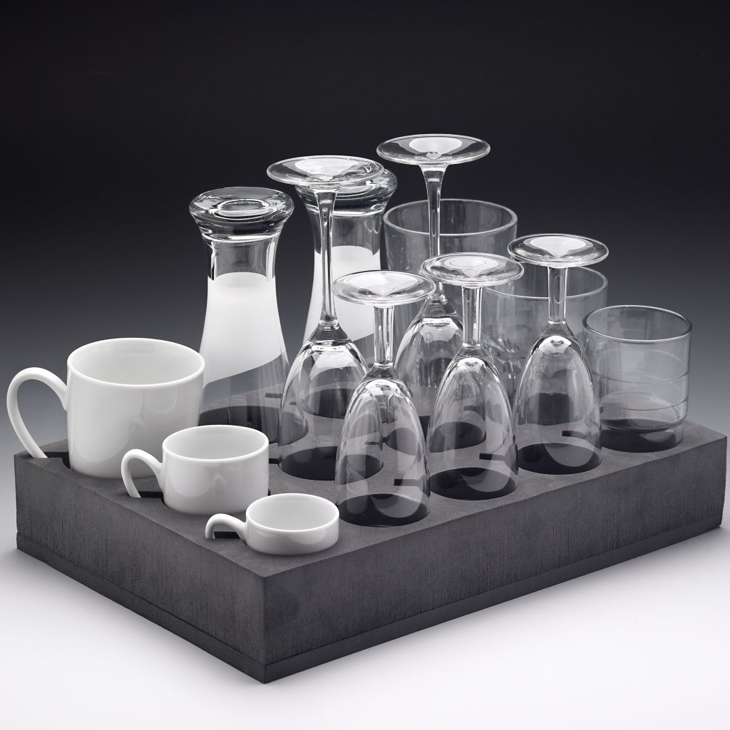 Universal Glas-/Tassenhalter aus weichem Gummikunststoff. Ideal zum Transportieren und Lagern ohne Klappern sowie Schutz vor Bruchgefahr während der Fahrt. Die Haltervertiefungen mit unterschiedlichen Durchmessern passen für Gläser und Tassen in den gängigen Standardgrößen. Zusätzliche Aussparungen für Tassenhenkel in den einzelnen Halterungen sorgen für passgenauen Sitz. Leicht zu reinigen, von hoher Qualität, rutschfest und formstabil.