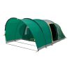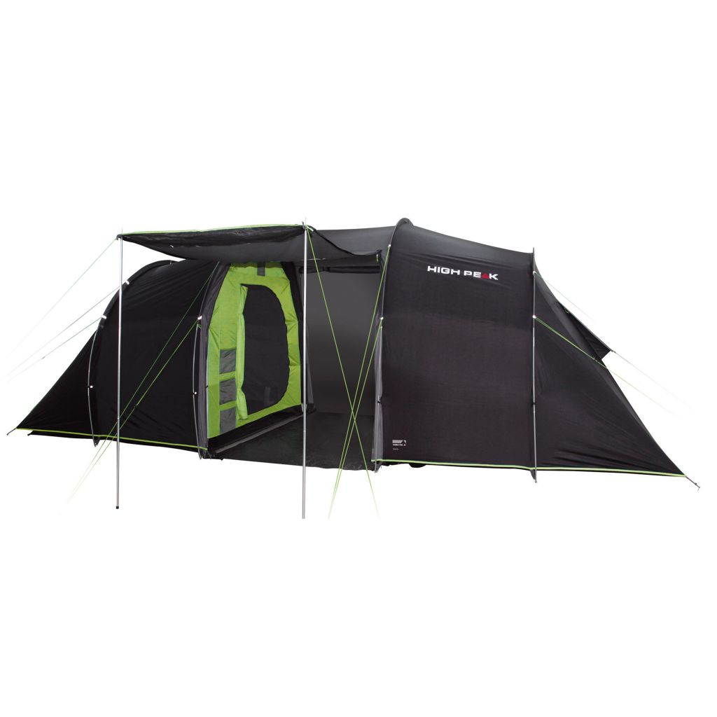 Zelt mit gegenüberliegenden Schlafkabinen. Tagsüber kann das Innenzelt zur Wohnraumvergrößerung ausgehängt werden. Die Eingänge der Schlafkabinen mit ganzflächigen Moskitonetztüren bieten optimale Belüftung und Insektenschutz. Organizer, Lampenhalter und Innenzelttaschen runden die Ausstattung ab. Der Wohnraum hat Lichtquellenfenster und einen pflegeleichten Zeltboden. Der Eingang kann als Sonnendach aufgestellt werden. Die gegenüberliegenden High Peak Vario Ventilationen belüften das Zelt auch bei regnerischem Wetter und sollten immer geöffnet sein. Die Reißverschlussabdeckung ist mit einer zusätzlichen Regenrinne ausgestattet. Das Außenzelt wird zuerst aufgebaut und dann die Innenzelte eingehängt.