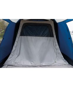 Vorderwand mit einem Moskitofenster (links) mit Außenklappe, zwei Zeltfenstern und Rundbogeneingang mit Stalltür-Effekt. Nur in Verbindung mit Komplettgestänge montierbar.