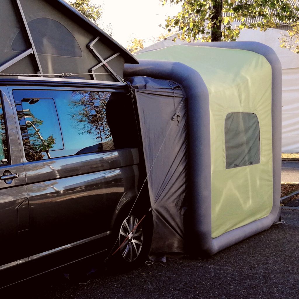 Die freistehende GT Box ist ein Multitalent: Sie ist als Heckzelt genauso geeignet wie als seitliches Vorzelt. Möglich wird das durch ihre zwei Anschlussoptionen, eine an ihrer hohen und eine an ihrer niedrigen Seite. Während sich die niedrige Seite für den Anschluss an Pkws und Busse eignet, dient die hohe Seite für den Anschluss an Reisemobile, Wohnwagen, Caravans oder Kastenwagen. Die GT Box ist ein ideales Vorzelt für alle, die ein flexibles und kompaktes Küchenvorzelt suchen.