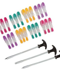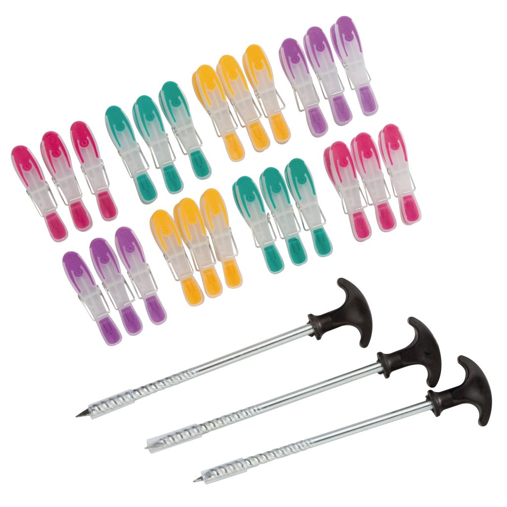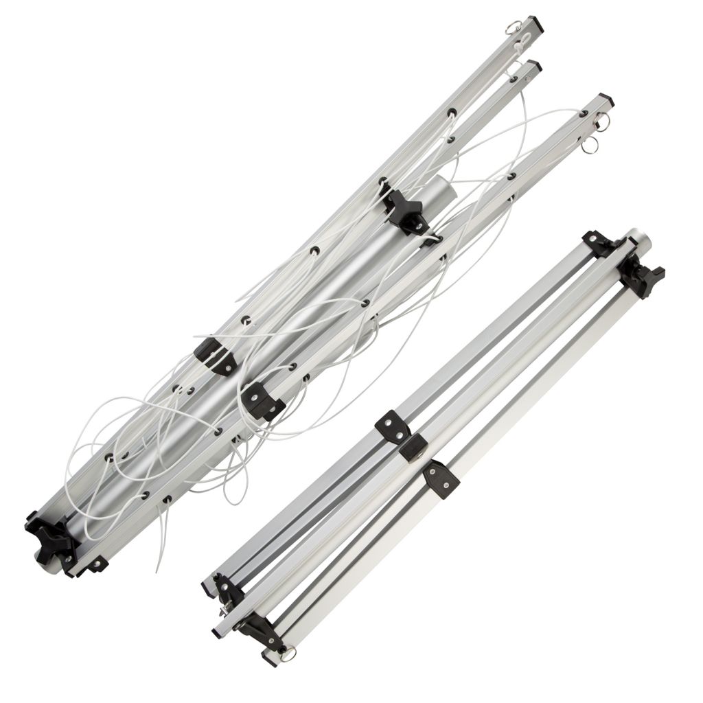 Alu-Wäschespinne mit Ständer und 24 Wäscheklammern bietet über 20 m Platz für Ihre Urlaubswäsche. Inklusive vier Multifunktionsringe für Kleiderbügel oder zum Abspannen. Stabile Ausführung mit 40 mm Rohrdurchmesser und windsicherer Stand durch drei stabile Schraubheringe. Leicht auf- und abzubauen. In der extra stabilen Packtasche mit doppelseitigem Reißverschluss kann die Spinne vor Verschmutzung geschützt und problemlos transportiert werden.