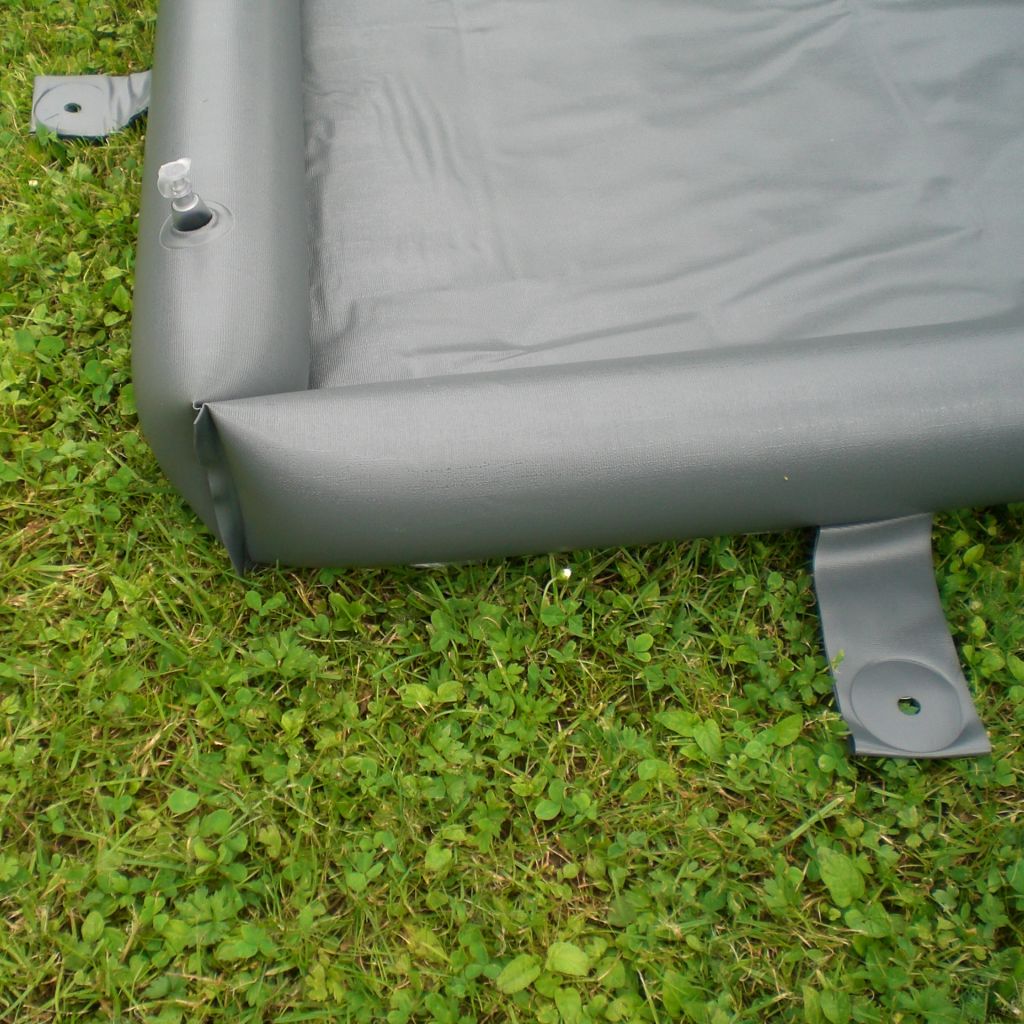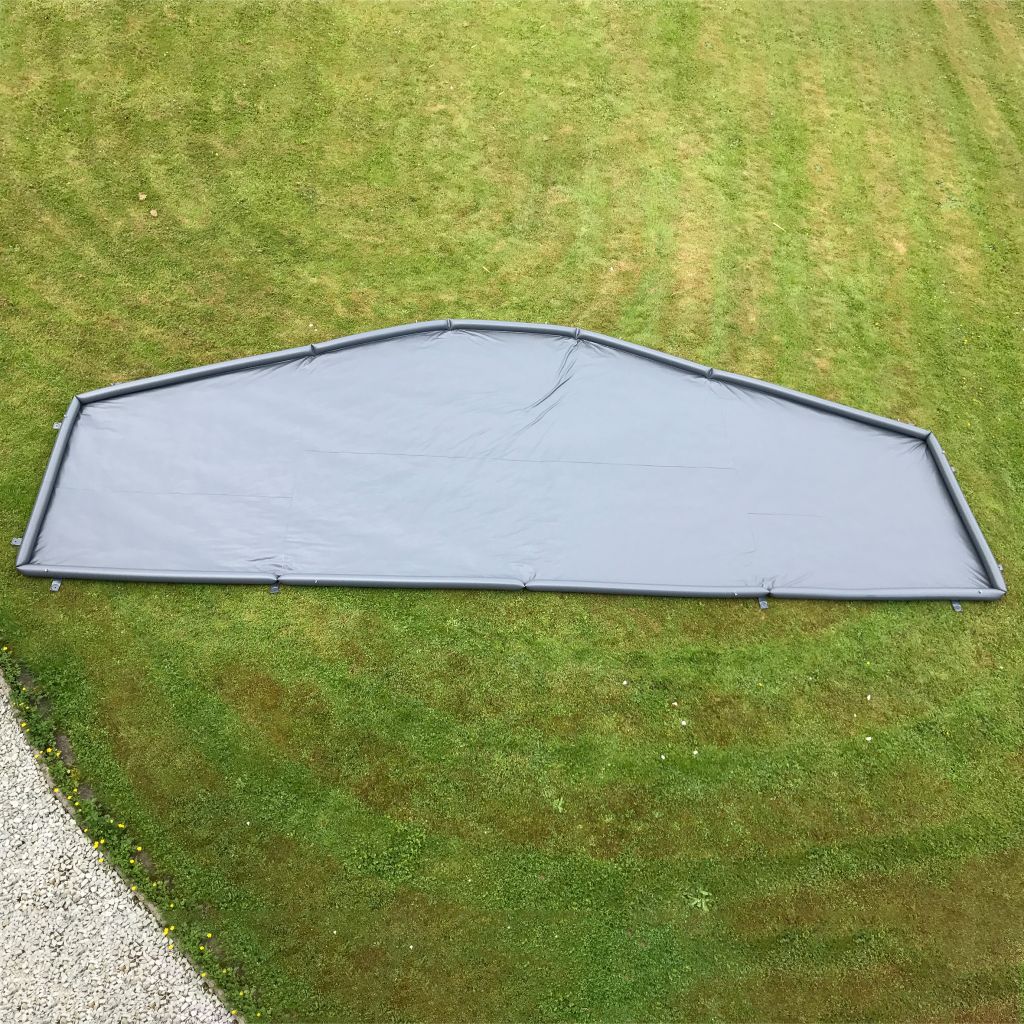 Schluss mit überschwemmten Vorzelt–Teppichen und schmutzigem Inventar nach Regenschauern. Einfach die Seitenränder der neuen Wasserschutzplane aufblasen und warten bis der Regenguss vorbei ist. Für alle Vorzelte, Zelte und Pavillons. Die Wasserschutzplane wird auf Maß, im 10 cm Raster gefertigt. Die Seitenränder sind in mehrere Kammern aufgeteilt. Somit können die Kammern die sich in den Durchgängen befinden, erst aufgeblasen werden, wenn „Gefahr“ droht.