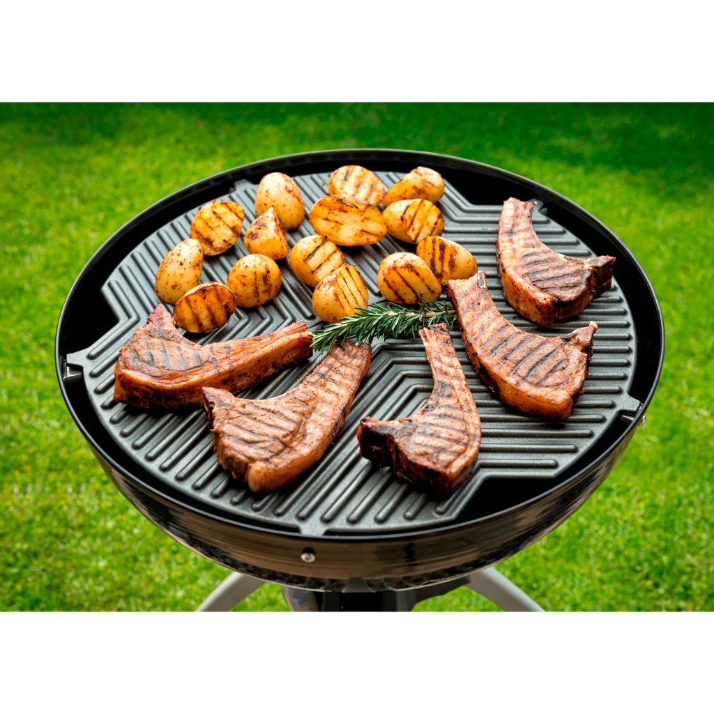Die wendbare Grillplatte mit einem Durchmesser von 36 cm ermöglicht ein vielseitiges Kochen auf dem CADAC Grillo Chef und Citi Chef 40. Die gerippte Seite ist ideal zum Grillen von Fleisch, Fisch und Hamburgern, während sich die flache Seite perfekt für Pfannkuchen, Gemüse oder Pfannengerichte eignet.