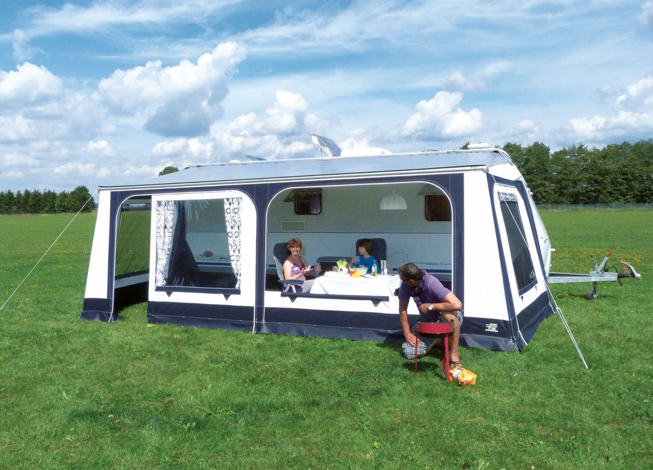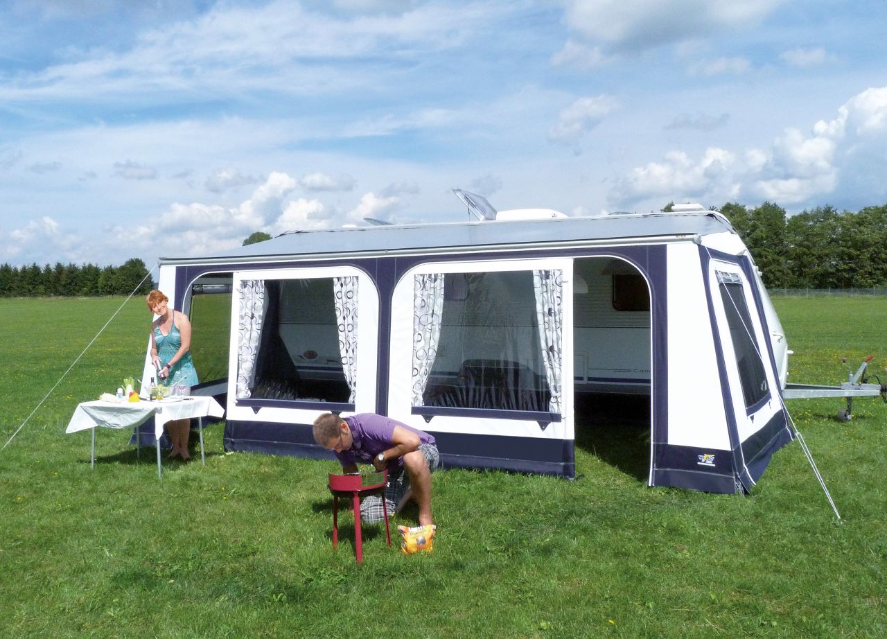 Das Rolli Plus Komfort verbindet die Vorzüge von Luxus mit großer Variabilität. Es wird ganz in die Zeltschiene eingezogen und ist dank des Gestänges mit Power-Grip-System schnell auf- bzw. abgebaut. Das Zelt verfügt über 2 Eingänge in der Vorderwand sowie je 1 Eingang in den Seitenwänden mit rundherum laufenden, abgedeckten Reißverschlüssen. Dabei sind die Vorderwandhälften gegeneinander tauschbar, so dass man die Eingänge wahlweise außen oder innen positionieren kann. Die Seiten sind mit verschließ- und ausstellbaren Air-Vent-Fenstern mit Folienfensterklappe versehen. Für das ultimative Frischlufterlebnis können sowohl die Seitenteile als auch beide Vorderwandhälften vollständig herausgenommen oder zur Veranda abgeklappt werden. Gardinen für Vorder- und Seitenwände sind im Lieferumfang enthalten. Das Dach des Rolli Plus Komfort besteht aus hochreflektierender Klimatisierungsdachware mit Easy-Clean-Schmutzbremse, Vorder- und Seitenwände sind aus Airtex gefertigt, der Faulstreifen und die Spritzwand aus PVC.