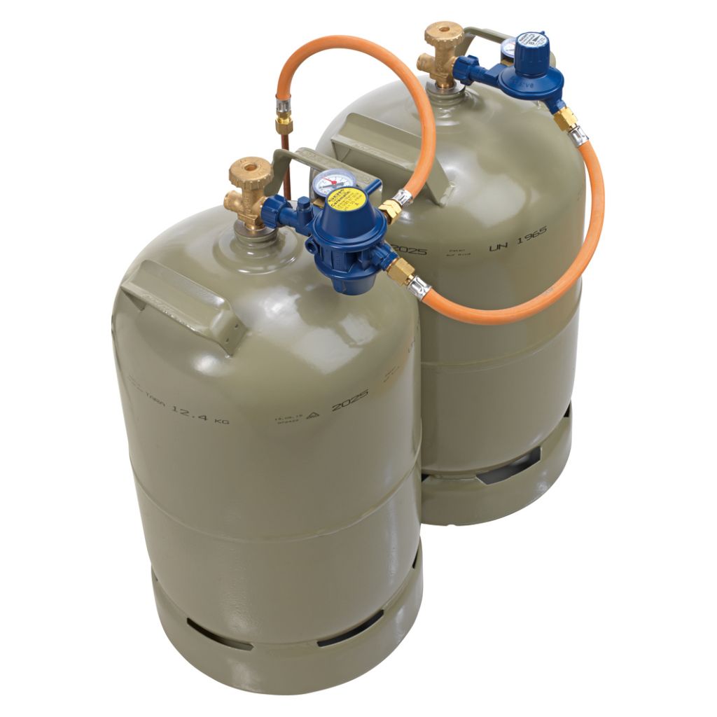 Regler-Umschaltautomatik, zum Anschluss an Gasflaschen, zur Druckregelung auf den Nenndruck des Gasgerätes.